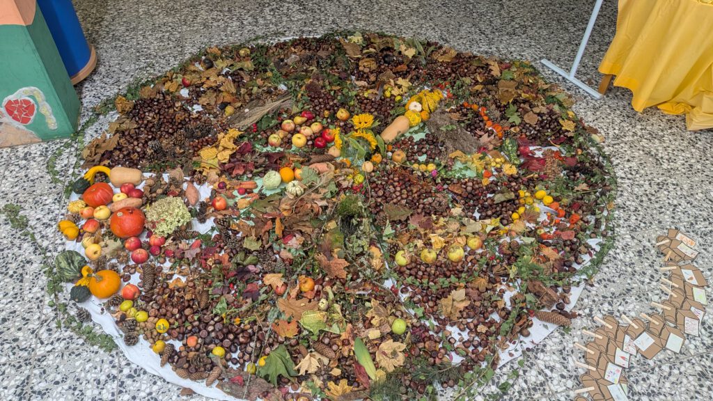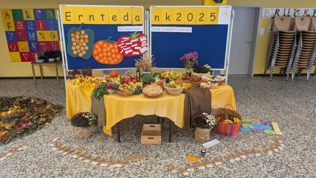 Für unsere Erntedankfeier am 08.10.2025 hatten die Kinder der 1. und 2. Klassen wie in jedem Jahr einen wunderschönen reich gedeckten Erntedanktisch gestaltet mit Obst und Gemüse. In der Mitte der Aula stand auf einem blauen, runden Tuch eine goldene Schatztruhe, in der sich ein ganz besonderes und wertvolles Geschenk befand.