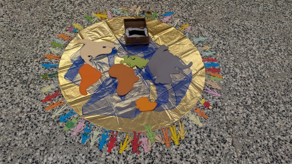 Die Kinder der 3. Klassen bereiteten Plakate vor, auf denen zu sehen war, warum die Erde für uns ein wertvoller Schatz ist. Sie überlegten sich, was die Erde uns schenkt und wie wir sie schützen können. Gleichzeitig wurde das blaue Tuch in der Mitte immer mehr zu unserer Erde mit Meeren und Kontinenten gestaltet.